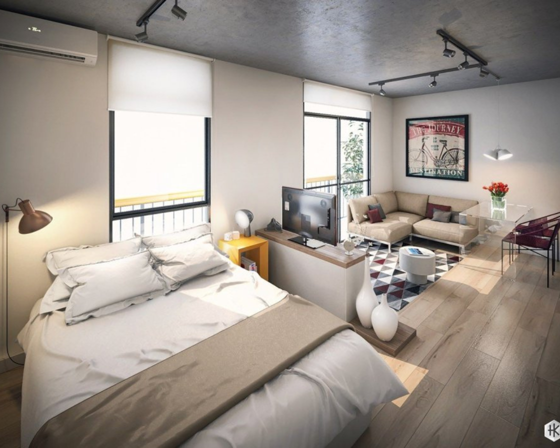 Private rooms with a bed and common area.